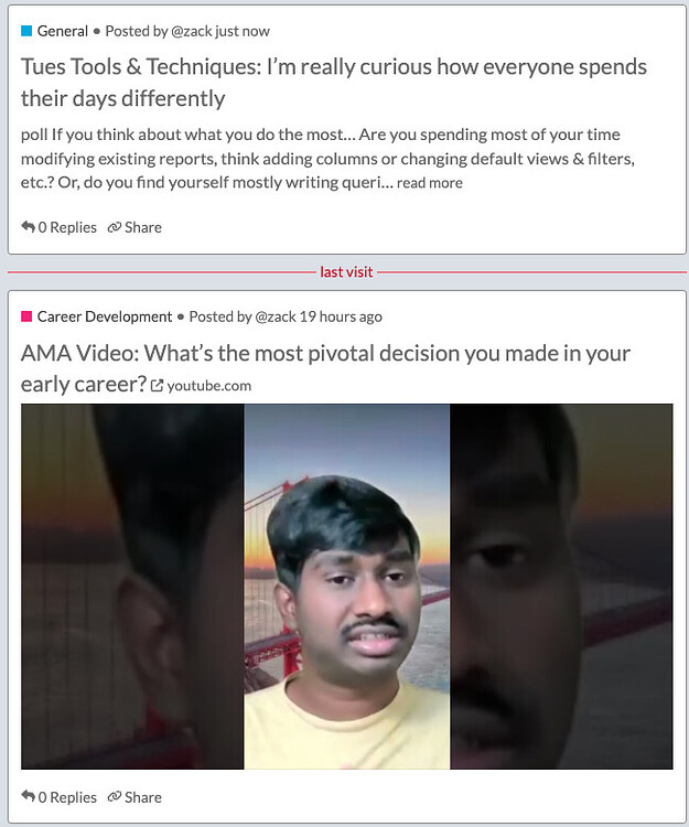 - The top post in my screenshot has a poll as the first thing on the post, but the poll doesn’t get shown on the topic preview. Can this be changed to show polls just like images (or the Youtube thumbnail in the above example) - essentially make it a media type that would be displayed in the topic preview rather than having to click into the topic?