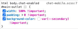 However the theme has a chat custom style when enabled on the #main-outlet which I think only need to be active on chat pages.