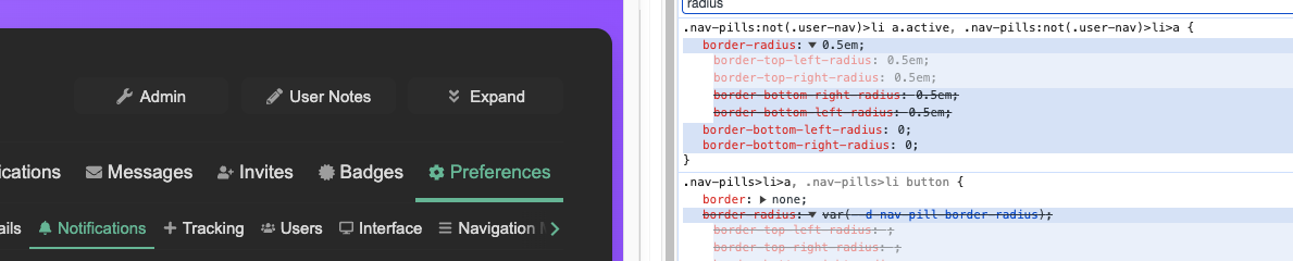 Hi folks, great theme. I have a minor nit with the border radius on the .nav-pils:not(.user-nav)>li>a selector, causing an inconsistent pointy border on the active tab: