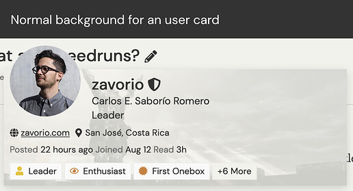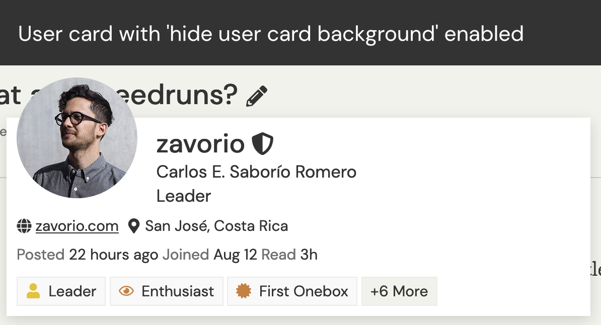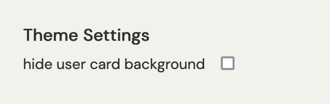 The theme does have one setting which might be a bit controversial. It is called ‘hide user card background’ and what it does is make it so that user card backgrounds are just white. We feel like even with the strong overlay Discourse uses by default, user cards backgrounds sometimes are a bit noisy.
