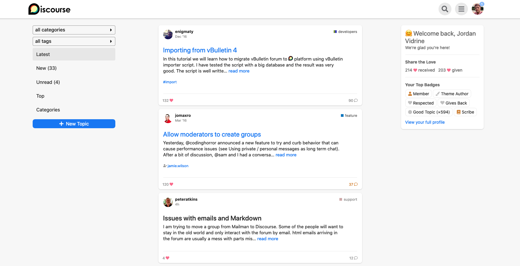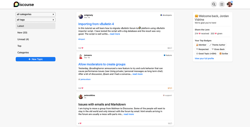 Hi @awesomerobot, comparing this theme to dev.to, is there a way to show all categories listed, rather than within a drop-down menu, on the left-hand side? Furthermore, I remember meta testing out a theme that let users follow categories to fine-tune/specify their activity stream ā is this functionality available, and can it be combined with Fakebook?
