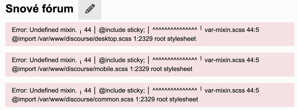 The SCSS mixin sticky has been removed from core recently (DEV: Remove unnecessary scss mixins (#31355) · discourse/discourse@46c568a · GitHub).