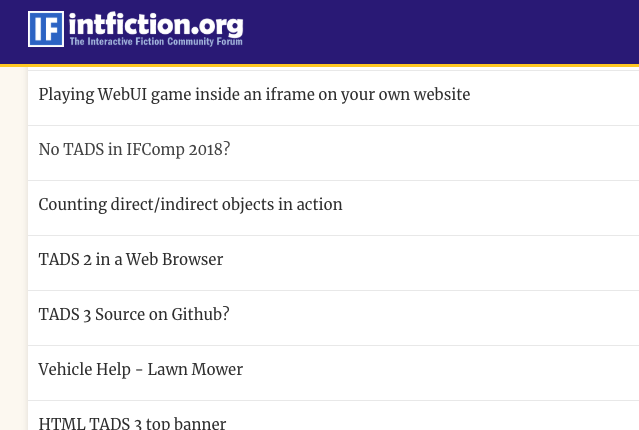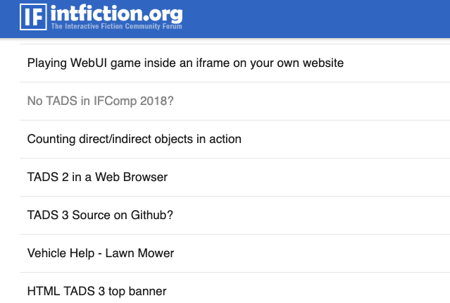 Here is our default theme. Notice the topic βNo TADS in IFComp 2018β is grey, meaning it has no new content. In the second one, this is not distinguishable. When previewing the theme in preview from here, it does have greyed-out topics.