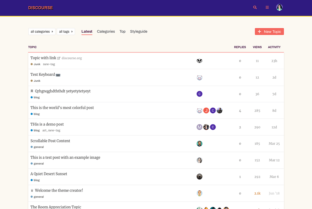 Hibiscus is a bright, colorful and warm Discourse theme. The name comes from the Spanish word βJamaicaβ for the Hibiscus flower. The theme supports both desktop and tablet/mobile styles.