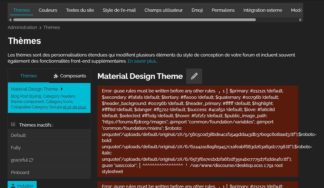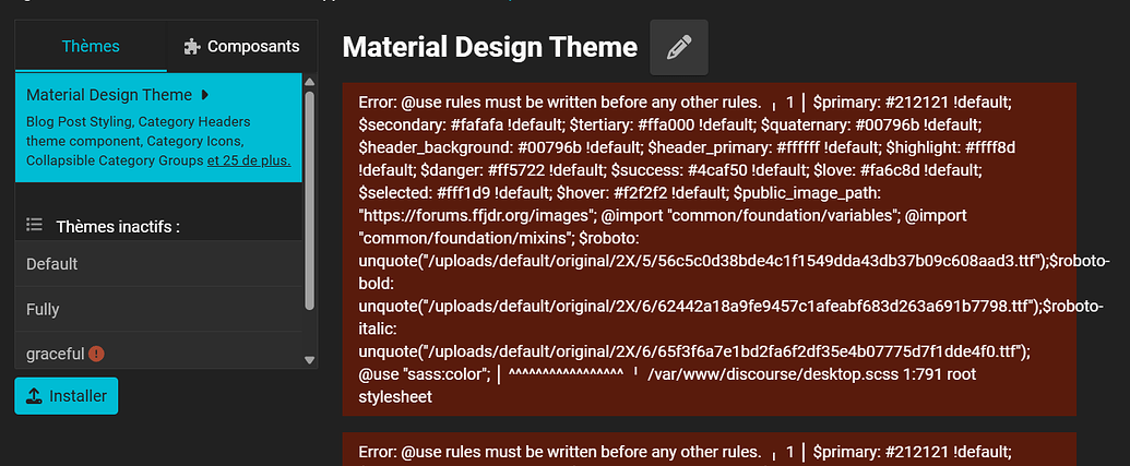 A fix was merged recently about it: DEV: Allow stylesheet entrypoints to use `@use` (#31905) · discourse/discourse@b1924c3 · GitHub