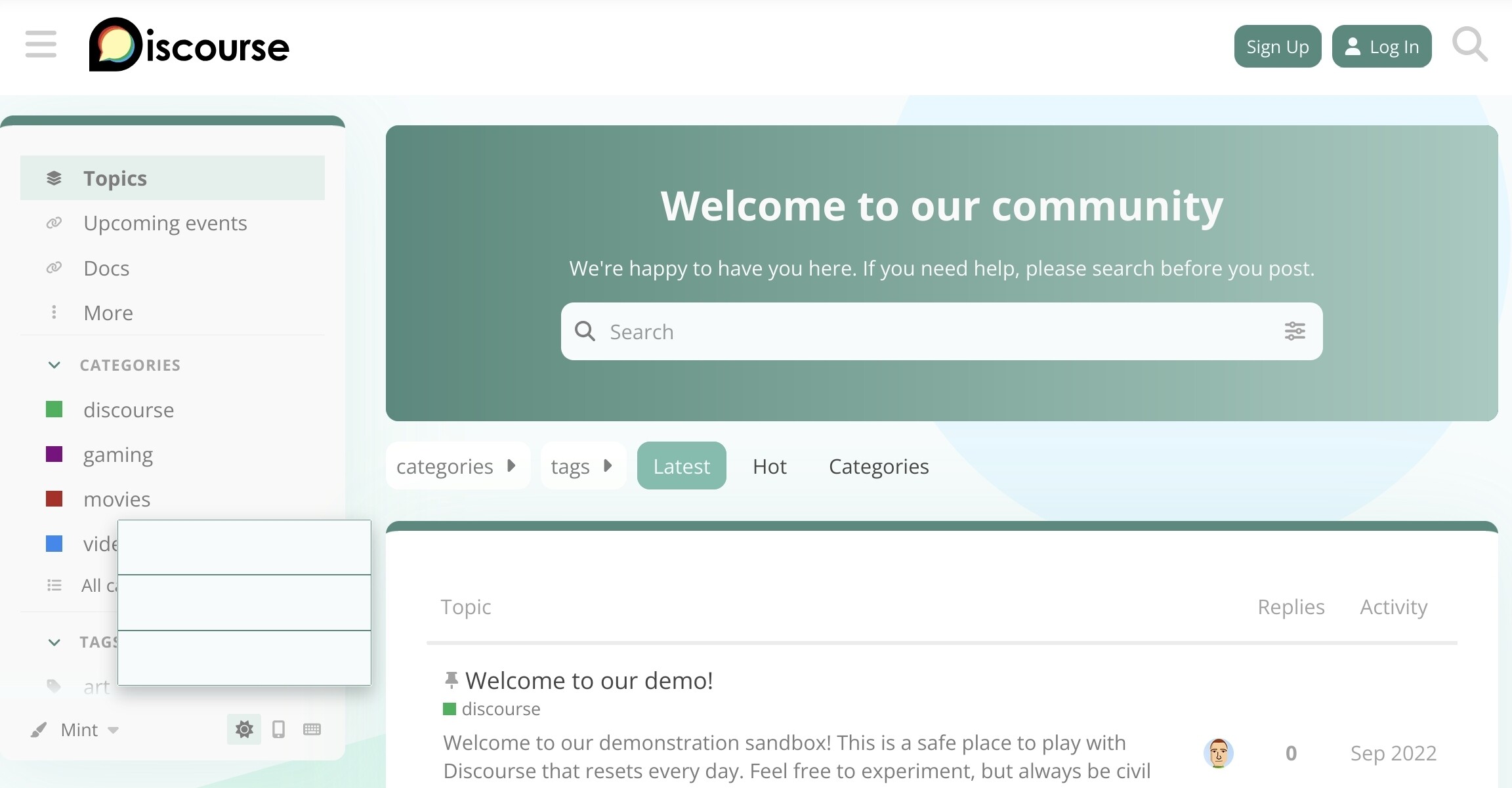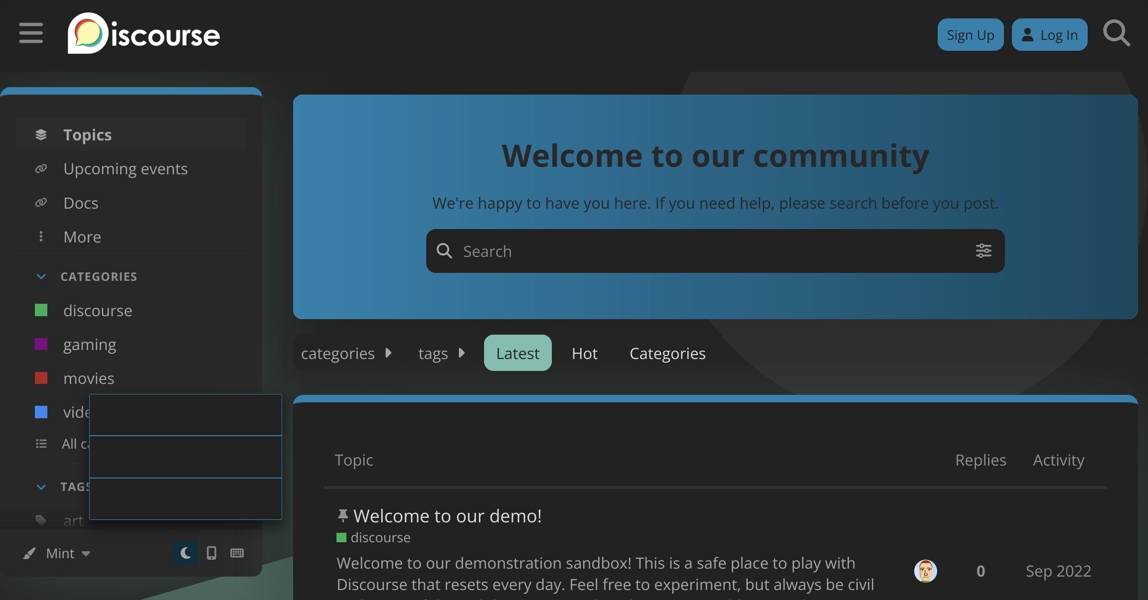 3.6.0.beta3-latest(tests-passed) - Theme source: https://github.com/discourse/discourse-mint-theme (default branch)