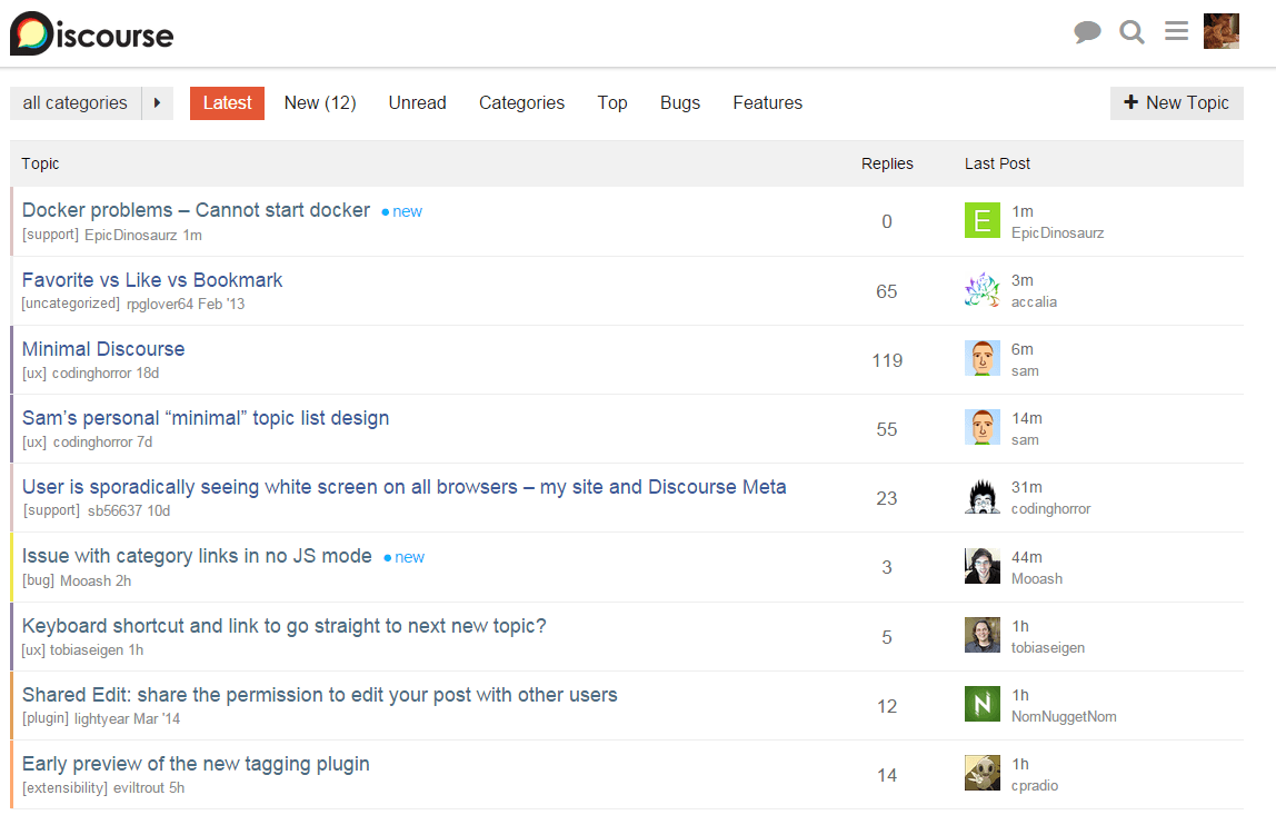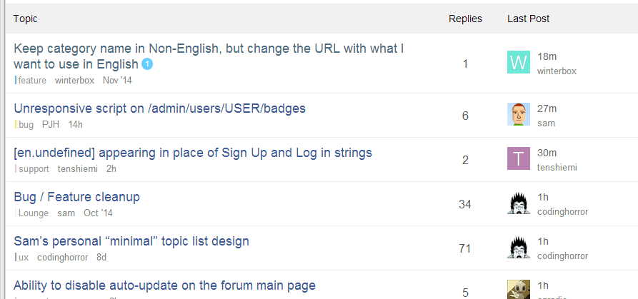 And the two avatars to show the original and last poster keeps some good info. Having it on the left makes the page feel more balanced, without something too âheavyâ drawing the eyes away past the list of topic titles. Leaving enough margin to read through the list of topics.