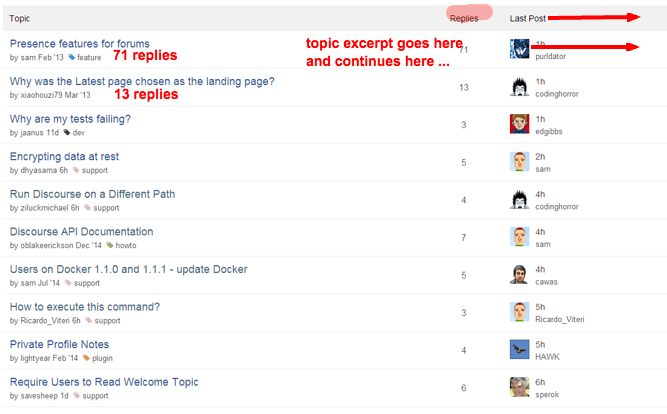 I love the direction this is headed. Very clean. At the risk of appearing more âsocialâ - Have you considered adding optional topic excerpts and/or image thumbnails? A nice responsive design that takes advantage of screen width âŠ