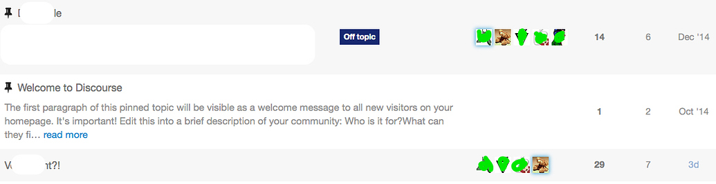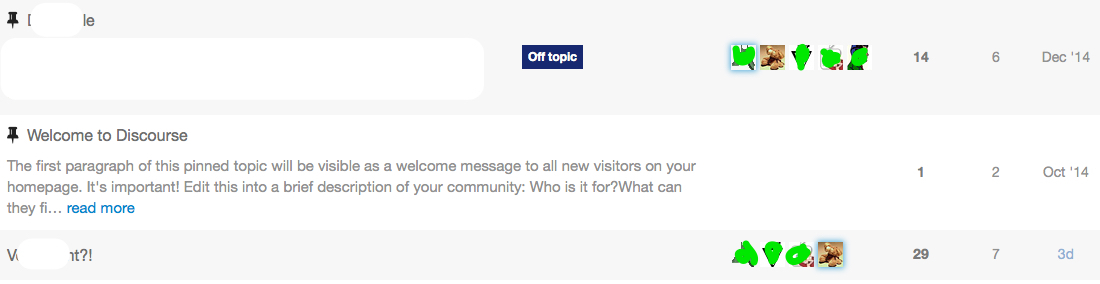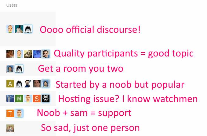 The 1-5 avatars next to each topic do provide a lot of information at a glance ā about people. Thatās appropriate, because discussion is made of people. At least, the last time I tried to have a discussion with the same person over and over it didnāt go so wellā¦