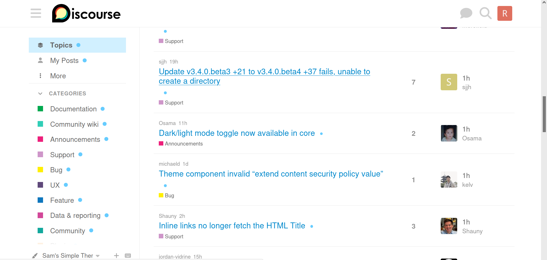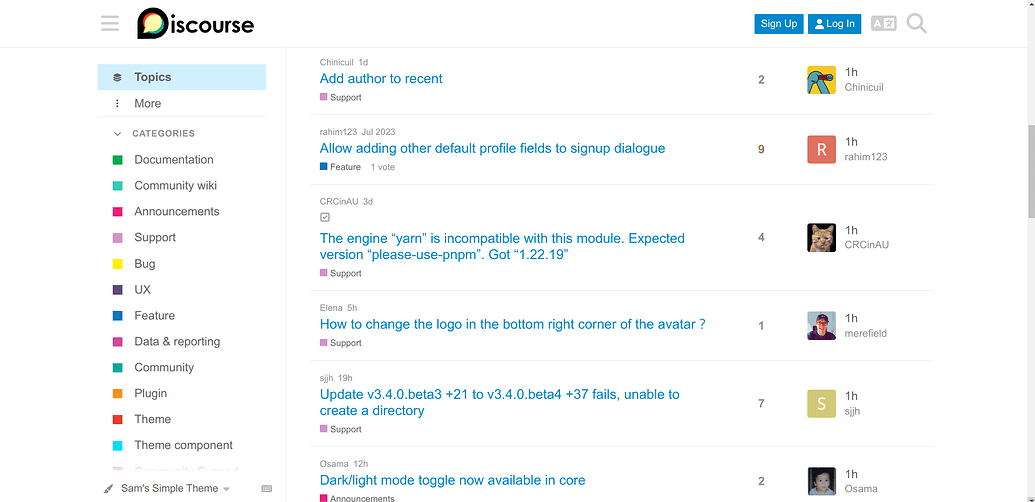 I should also just mention that I am very thankful for Sam’s Simple Theme. When I migrated my large forum to Discourse my users absolutely hated the default Discourse theme, but they found Sam’s Simple Theme layout much more acceptable, so thanks for creating and maintaining it, it’s a key component for me to make Discourse viable.