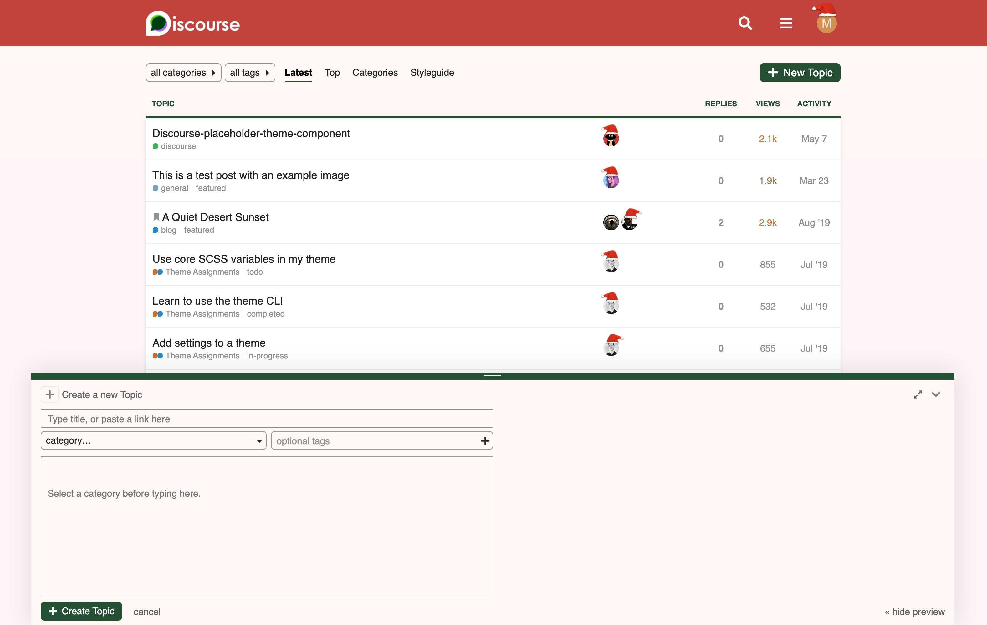 The theme also has a site setting to enable/disable Christmas hats. The Christmas hats were inspired from @barryvan βs excellent Christmas hats component .